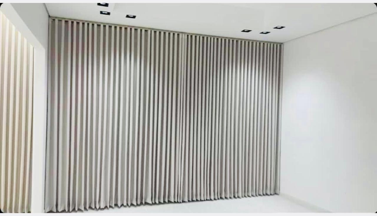 Elegant floor-to-ceiling ripple-fold curtains crafted in soft beige blackout fabric, offering a smooth drape, modern luxury styling, and excellent light control.